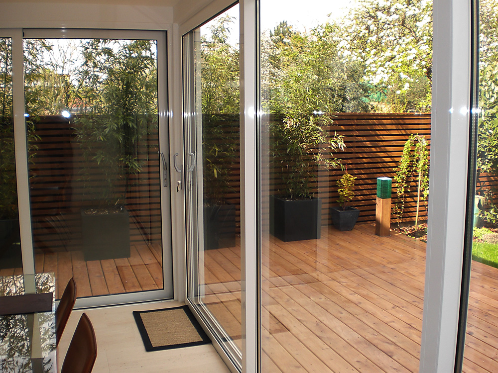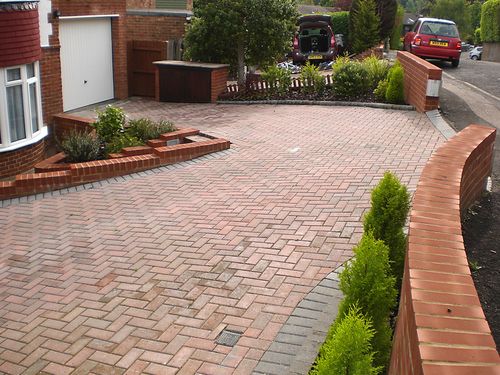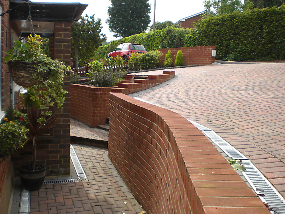Next two images show parking build of red engineering brick. It was complicated job because as you may guess the surface is very sloppy, this is why we cut down and build a wall in front of the house, which gives some sort of privacy and protection from the wind. Next three images show lovely decking, fence made of timer and paving in a small yard.
